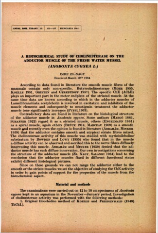 Zs.-Nagy, Imre (1964) A histochemical study of cholinesterase on the adductor muscle of the fresh water mussel (Anodonta cygnea L.). A Magyar Tudományos Akadémia Tihanyi Biológiai Kutatóintézetének évkönyve, 31. pp. 153-157. ISSN 0365-3005