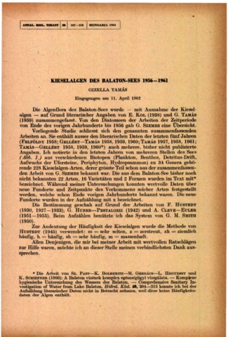 Tamás, Gizella (1963) Kieselalgen des Balaton-Sees 1956-1961. A Magyar Tudományos Akadémia Tihanyi Biológiai Kutatóintézetének évkönyve, 30. pp. 167-218. ISSN 0365-3005