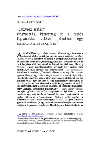 Olga, Sevchenko (2015) „Tűzvész esetén”. Fogyasztás, biztonság és a tartós fogyasztási cikkek jelentése egy átalakuló társadalomban. REGIO: KISEBBSÉG KULTÚRA POLITIKA TÁRSADALOM, 23 (2). pp. 212-241. ISSN 0865-557X (nyomtatott); 2415-959X (online)