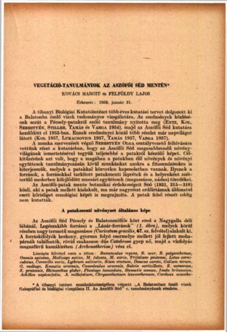 Kovács, Margit and Felföldy, Lajos (1958) Vegetáció-tanulmányok az Aszófői Séd mentén. A Magyar Tudományos Akadémia Tihanyi Biológiai Kutatóintézetének évkönyve, 25. pp. 137-163. ISSN 0365-3005