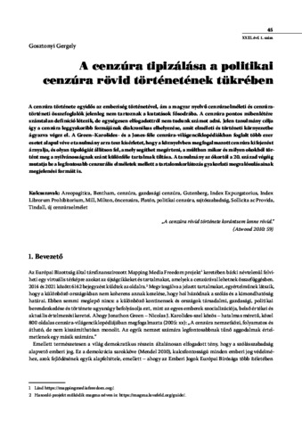 A cenzúra története egyidős az emberiség történetével, ám a magyar nyelvű cenzúraelméleti és cen zúratörténeti összefoglalók jelenleg nem tartoznak a kutatások fősodrába. A cenzúra pontos mibenlétére számtalan definíció létezik, de egységesen elfogadottról nem tudunk számot adni. Jelen tanulmány célja így a cenzúra leggyakoribb formájának diakronikus elhelyezése, amit elméleti és történeti környezetbe ágyazva végez el. A Green–Karolides- és a Jones-féle cenzúra-világenciklopédiákban foglalt több ezer esetet alapul véve e tanulmány arra tesz kísérletet, hogy a köznyelvben megfogalmazott cenzúra kifejezést árnyalja, és olyan tipológiát állítson fel, amely segíthet megérteni, a múltban mikor és milyen okokból történt meg a nyilvánosságnak szánt különféle tartalmak tiltása. A tanulmány az ókortól a 20. század végéig mutatja be a legfontosabb cenzurális elméletek mellett a tartalomkorlátozás gyakorlati megvaló sulásainak megjelenési formáit is.