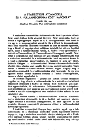 Gombás, Pál (1954) A statisztikus atommodell és a hullámmechanika közti kapcsolat. A MAGYAR TUDOMÁNYOS AKADÉMIA MATEMATIKAI ÉS FIZIKAI OSZTÁLYÁNAK KÖZLEMÉNYEI, 4 (3). pp. 317-326.