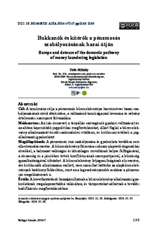 Tóth, Mihály (2024) Bukkanók és kitérők a pénzmosás szabályozásának hazai útján = Bumps and detours of the domestic pathway of money laundering legislation. BELÜGYI SZEMLE / ACADEMIC JOURNAL OF INTERNAL AFFAIRS: A BELÜGYMINISZTÉRIUM SZAKMAI TUDOMÁNYOS FOLYÓIRATA (2010-), 72 (7). pp. 1143-1165. ISSN 2062-9494