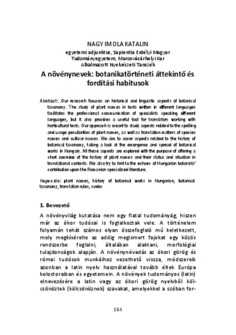 Nagy, Imola Katalin (2019) A növénynevek: botanikatörténeti áttekintő és fordítási habitusok. In: A fordítás elméleti és gyakorlati kérdései. Modern Filológiai Társaság, Budapest, pp. 184-200. ISBN 9789635089109