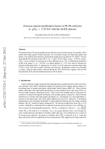 Grelli, A. and Abelev, B. and Adam, J. and Adamová, D. and Adare, A. M. and Aggarwal, M. M. and Aglieri, R. G. and Agócs, András and Agostinelli, A. and Aguilar, S. S. and Ahammed, Z. and Ahmad, A. and Ahmad, N. and Ahn, S. A. and Ahn, S. U. and Akindinov, A. and Aleksandrov, D. and Alessandro, B. and Alfaro, M. J. R. and Alici, A. and Alkin, A. and Alme, J. and Alt, T. and Altini, V. and Altinpinar, S. and Altsybeev, I. and Andrei, C. and Andronic, A. and Anguelov, V. and Anielski, J. and Barnaföldi, Gergely Gábor and Bencédi, Gyula and Berényi, Dániel and Boldizsár, László and Dénes, Ervin and Hamar, Gergő and Lévai, Péter and Molnár, Levente and Pochybova, Sona (2013) D meson nuclear modification factors in Pb–Pb collisions at √sNN = 2.76 TeV with the ALICE detector. NUCLEAR PHYSICS A, 904-90. 635C-638C. ISSN 0375-9474