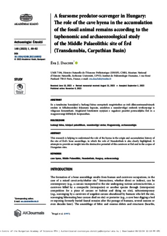 Daschek, Éva Jacqueline (2023) A fearsome predator-scavenger in Hungary : The role of the cave hyena in the accumulation of the fossil animal remains according to the taphonomic and archaeozoological study of the Middle Palaeolithic site of Érd (Transdanubia, Carpathian Basin) = Egy félelmetes ragadozó-dögevő Magyarországon: A barlangi hiéna szerepe az érdi (Dunántúl, Kárpát-medence) középső paleolitikus lelőhely állatcsontmaradványainak felhalmozódásában tafonómiai és archaeozoológiai vizsgálat alapján. ARCHAEOLOGIAI ÉRTESÍTŐ (BUDAPEST), 148 (1). pp. 69-92. ISSN 0003-8032