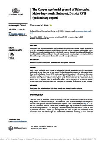 Munkáné Virág, Zsuzsanna (2023) The Copper Age burial ground of Rákoscsaba, Major-hegy north, Budapest, District XVII (preliminary report) = Rézkori temetkezési hely: Budapest XVII. ker., Rákoscsaba, Major-hegy, észak (előzetes jelentés). ARCHAEOLOGIAI ÉRTESÍTŐ (BUDAPEST), 148 (1). pp. 111-155. ISSN 0003-8032