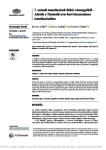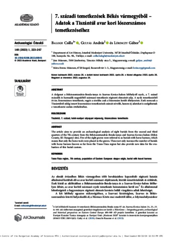 A dolgozat a Békésszentandrás-Benda-tanya és Szarvas-Kovács-halom lelőhelyről nyolc, a 7. század második és harmadik negyedéből származó temetkezés régészeti elemzését adja. A nyolc temetkezésből öt ún. lószerszámos temetkezés, vagyis a sírokba csak a lószerszám került elhelyezésre. Ezek nemcsak a Tiszántúlról eddig ismert lószerszámos temetkezések számát növelik, hanem új adatokat is szolgáltatnak e temetkezési szokás értékeléséhez. | The article aims to provide an archaeological analysis of eight burials from the second and third quarters of the 7th century from the Békésszentandrás-Benda-tanya and Szarvas-Kovács-halom (Békés County, SE-Hungary) sites. Five of the eight graves were referred to as burials with horse harness, which means that only the horse tools were placed in the graves. These not only increase the number of burials with horse harness known so far from the Trans-Tisza region but also provide new data for the evaluation of this burial custom.