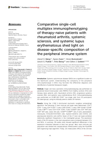 Balog, József Ágoston and Zvara, Ágnes and Bukovinszki, Vivien and Puskás, László and Balog, Attila and Szebeni, Gábor (2024) Comparative single-cell multiplex immunophenotyping of therapy-naive patients with rheumatoid arthritis, systemic sclerosis, and systemic lupus erythematosus shed light on disease-specific composition of the peripheral immune system. FRONTIERS IN IMMUNOLOGY, 15. No.-1376933. ISSN 1664-3224
