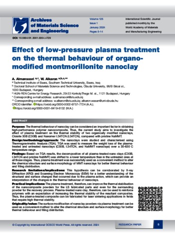 Almansoori, A. and Alkaron, Wasan (2024) Effect of low-pressure plasma treatment on the thermal behaviour of organo-modified montmorillonite nanoclay. ARCHIVES OF MATERIALS SCIENCE AND ENGINEERING, 125 (1). pp. 5-14. ISSN 1897-2764
