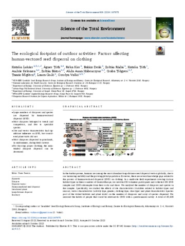 Lukács, Katalin and Tóth, Ágnes and Kiss, Réka and Deák, Balázs and Rádai, Zoltán and Tóth, Katalin and Kelemen, András and Bátori, Zoltán and Hábenczyus, Alida Anna and Tölgyesi, Csaba and Miglécz, Tamás and Godó, Laura and Valkó, Orsolya (2024) The ecological footprint of outdoor activities : Factors affecting human-vectored seed dispersal on clothing. SCIENCE OF THE TOTAL ENVIRONMENT, 906. No. 167675. ISSN 0048-9697