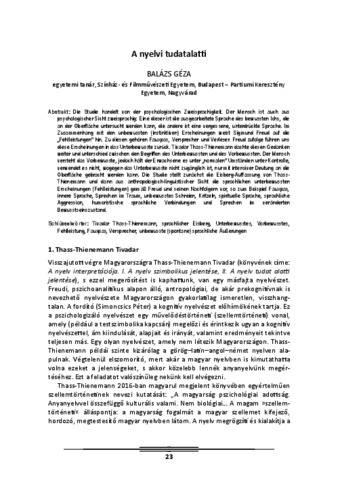 Balázs, Géza (2024) A nyelvi tudatalatti. In: Nyelvünkben élünk. Jelentéseken innen és túl. Tanulmánykötete az MTA Modern Filológiai Társaság alapításának 40. évfordulója és Gadányi Károly 80. születésnapja tiszteletére. Nyomárkay István-emléksorozat (4). MTA Modern Filológiai Társaság, Budapest, pp. 23-29. ISBN 978-615-6448-41-5