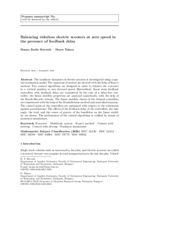 Horváth, Hanna Zsófia and Takács, Dénes (2024) Balancing riderless electric scooters at zero speed in the presence of a feedback delay. MULTIBODY SYSTEM DYNAMICS. ISSN 1384-5640 (In Press)