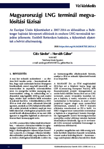 Götz, Sándor and Horváth, Gábor (2023) Magyarországi LNG terminál megvalósítási fázisai = Implementation phases of an LNG terminal in Hungary. KÖZLEKEDÉSTUDOMÁNYI SZEMLE, 73 (6). pp. 14-26. ISSN 0023-4362