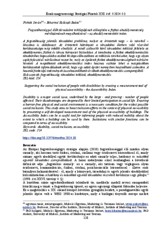 Piskóti, István and Bihariné Kalászdi, Beáta (2024) Fogyatékossággal élők társadalmi inklúziójának elősegítése a fizikai akadálymentesség mérőszámának megalkotásával – az akadálymentesítési index. ÉSZAK-MAGYARORSZÁGI STRATÉGIAI FÜZETEK, 21 (03). pp. 128-138. ISSN 1786-1594