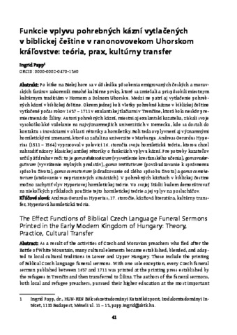 Papp, Ingrid (2024) Funkcie vplyvu pohrebných kázní vytlačených v biblickej češtine v ranonovovekom Uhorskom kráľovstve : teória, prax, kultúrny transfer = The Effect Functions of Biblical Czech Language Funeral Sermons Printed in the Early Modern Kingdom of Hungary : Theory, Practice, Cultural Transfer. In: Kazateľská tvorba, jej recepcia a stimuly : Zborník štúdií z medzinárodnej vedeckej konferencie (Bratislava 21. 11. – 22. 11. 2023). University of Ss. Cyril and Methodius in Trnava; Institute of Slovak Literature, Slovak Academy of Sciences, Trnava, pp. 41-47. ISBN 978-80-572-0447-3