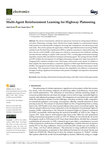 Kolat, Máté and Bécsi, Tamás (2023) Multi-Agent Reinforcement Learning for Highway Platooning. ELECTRONICS (SWITZ), 12 (24). No. 4963. ISSN 2079-9292