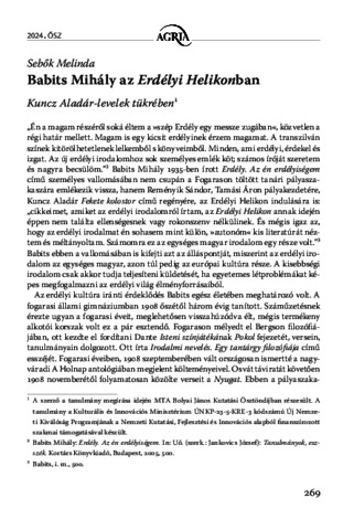 Sebők, Melinda (2024) Babits Mihály az Erdélyi Helikonban : Kuncz Aladár-levelek tükrében. AGRIA, 3. pp. 269-277. ISSN 1789-4379