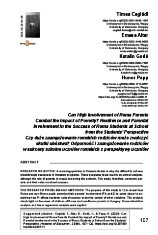 Ceglédi, Tímea and Alter, Emese and Godó, Katalin and Papp, Hunor (2024) Can High Involvement of Roma Parents Combat the Impact of Poverty? Resilience and Parental Involvement in the Success of Roma Students at School from the Students’ Perspective. HORYZONTY WYCHOWANIA, 23 (66). pp. 107-120. ISSN 1643-9171
