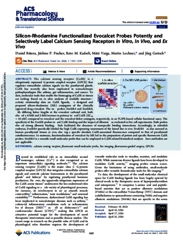 Bátora, Dániel and Fischer, Jerome P. and Kaderli, Reto M and Varga, Máté and Lochner, Martin and Gertsch, Jürg (2024) Silicon-Rhodamine Functionalized Evocalcet Probes Potently and Selectively Label Calcium Sensing Receptors In Vitro, In Vivo, and Ex Vivo. ACS PHARMACOLOGY & TRANSLATIONAL SCIENCE, 7 (5). pp. 1557-1570. ISSN 2575-9108