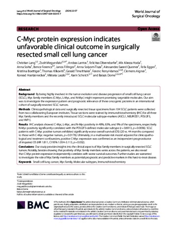Lang, Christian and Megyesfalvi, Zsolt and Lantos, Andras and Oberndorfer, Felicitas and Hoda, Mir Alireza and Solta, Anna and Ferencz, Bence and Fillinger, Janos and Solyom-Tisza, Anna and Querner, Alessandro Saeed and Egger, Felix and Boettiger, Kristiina and Klikovits, Thomas and Timelthaler, Gerald and Renyi-Vamos, Ferenc and Aigner, Clemens and Hoetzenecker, Konrad and Laszlo, Viktoria and Schelch, Karin and Dome, Balazs (2024) C-Myc protein expression indicates unfavorable clinical outcome in surgically resected small cell lung cancer. World Journal of Surgical Oncology, 22 (1). No.-57. ISSN 1477-7819