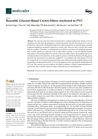 Varga, Bertalan and Ujj, Dóra and Mátravölgyi, Béla and Szolnoki, Beáta and Koczka, Béla and Rapi, Zsolt (2023) Reusable glucose-based crown ethers anchored to PVC. MOLECULES, 28 (23). p. 97905. ISSN 1420-3049