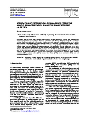 Horváthné Drégelyi-Kiss, Ágota (2024) Application Of Experimental Design-Based Predictive Models And Optimization In Additive Manufacturing – A Review. HUNGARIAN JOURNAL OF INDUSTRY AND CHEMISTRY, 52 (1). pp. 55-70. ISSN 0133-0276