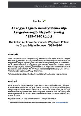 Stier (Kovács), Petra (2024) A Lengyel Légierő személyzetének útja Lengyelországtól Nagy-Britanniáig 1939–1940 között. HADTUDOMÁNYI SZEMLE, 17 (2). pp. 65-71. ISSN 2676-9816