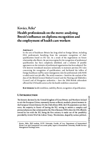 Kovács, Réka (2024) Healt professionals on the move: analysing Brexit’s influence on diploma recognition and the employment of health care workers. ANNALES UNIVERSITATIS SCIENTIARUM BUDAPESTINENSIS DE ROLANDO EÖTVÖS NOMINATAE - SECTIO IURIDICA, 62 (1). pp. 163-188. ISSN 0524-899X