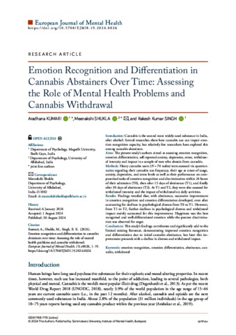 Kumari, Aradhana and Shukla, Meenakshi and Singh, Rakesh Kumar (2024) Emotion Recognition and Differentiation in Cannabis Abstainers Over Time: Assessing the Role of Mental Health Problems and Cannabis Withdrawal. EUROPEAN JOURNAL OF MENTAL HEALTH, 19. pp. 1-19. ISSN 1788-7119