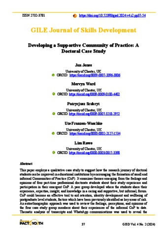 Jones, Jan and Ward, Mervyn and Szubryt, Patrycjusz and Franzen-Waschke, Ute and Rowe, Lisa (2024) Developing a Supportive Community of Practice: A Doctoral Case Study. GILE JOURNAL OF SKILLS DEVELOPMENT, 4 (2). pp. 37-54. ISSN 2732-3781