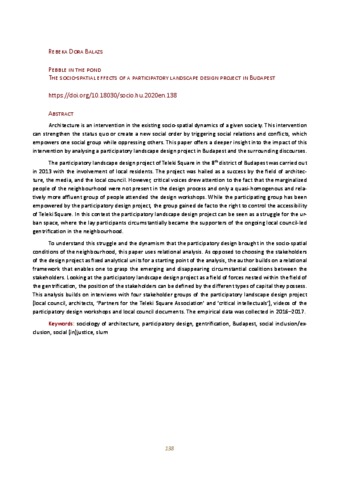 Balázs, Rebeka Dóra (2020) Pebble in the pond : The socio-spatial effects of a participatory landscape design project in Budapest. SOCIO.HU : TÁRSADALOMTUDOMÁNYI SZEMLE, 10 (Specia). pp. 138-159. ISSN 2063-0468