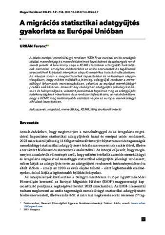 Urbán, Ferenc (2024) A migrációs statisztikai adatgyűjtés gyakorlata az Európai Unióban. MAGYAR RENDÉSZET, 24 (3). pp. 141-154. ISSN 1586-2895
