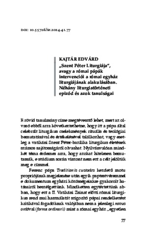 Kajtár, Edvárd (2024) „Szent Péter Liturgiája”, avagy a római pápák intervenciói a római egyház liturgiájának alakulásában. Néhány liturgiatörténeti epizód és azok tanulságai. In: Az ünneplés művészete. Konferenciakötet. Sapientia Füzetek (41). L'Harmattan Kiadó - Sapientia Szerzetesi Hittudományi Főiskola, Budapest, pp. 77-94. ISBN 978-615-6277-10-7