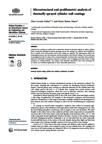 Kókai, Ákos Levente and Marosné Berkes, Mária (2024) Microstructural and profilometric analysis of thermally sprayed cylinder wall coatings. POLLACK PERIODICA: AN INTERNATIONAL JOURNAL FOR ENGINEERING AND INFORMATION SCIENCES, 19 (3). pp. 87-94. ISSN 1788-1994