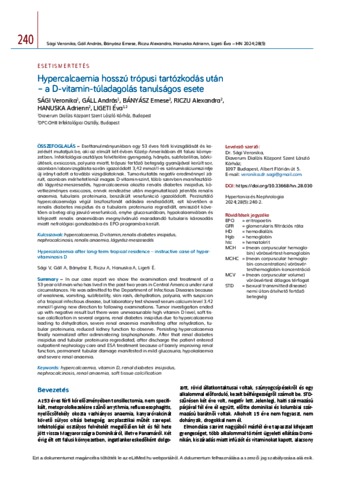 Sági, Veronika and Gáll, András and Bányász, Emese and Riczu, Alexandra and Hanuska, Adrienn and Ligeti, Éva (2024) Hypercalcaemia hosszú trópusi tartózkodás után – a D-vitamin-túladagolás tanulságos esete. HYPERTONIA ÉS NEPHROLOGIA, 28 (5). pp. 240-242. ISSN 1418-477X