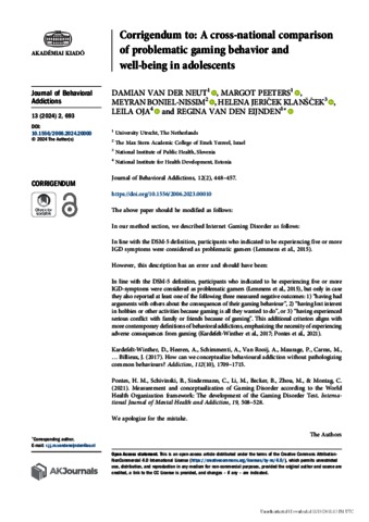 Neut, Damian van der and Peeters, Margot and Boniel-Nissim, Meyran and Klanšček, Helena Jeriček and Oja, Leila and Eijnden, Regina van den (2024) Corrigendum to: A cross-national comparison of problematic gaming behavior and well-being in adolescents. JOURNAL OF BEHAVIORAL ADDICTIONS, 13 (2). p. 693. ISSN 2062-5871 (print); 2063-5303 (online)