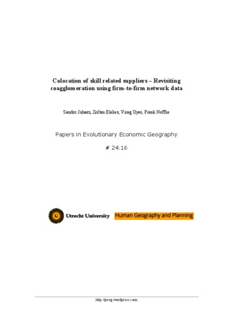 Juhász, Sándor and Elekes, Zoltán and Ilyés, Virág and Neffke, Frank (2024) Colocation of skill related suppliers – Revisiting coagglomeration using firm-to-firm network data. Papers in Evolutionary Economic Geography (24.16). Utrecht University, Utrecht.