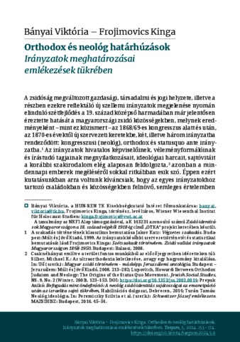 Bányai, Viktória and Frojimovics, Kinga (2024) Orthodox és neológ határhúzások : Irányzatok meghatározásai emlékezések tükrében = Orthodox and Neolog Boundaries – Definitions of Movements Reflected in Memoirs. TARGUM: INTERPRETÁCIÓ KOMMENTÁR DISKURZUS, 2024 (5). pp. 153-174. ISSN 2939-5976