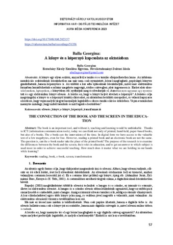 Balla, Georgina (2024) A könyv és a képernyő kapcsolata az oktatásban = The connection of the book and the screen in the education. In: Agria Média 2023 : „A magas szintű digitális kompetencia a jövő oktatásának kulcsa”. Eszterházy Károly Katolikus Egyetem Líceum Kiadó, pp. 57-61.