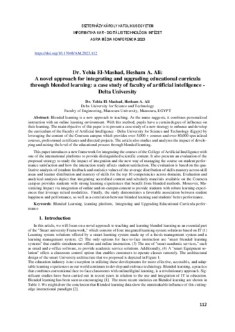 El-Mashad, Yehia and Ali, Hesham A. (2024) A novel approach for integrating and upgrading educational curricula through blended learning: a case study of faculty of artificial intelligence - Delta University. In: Agria Média 2023 : „A magas szintű digitális kompetencia a jövő oktatásának kulcsa”. Eszterházy Károly Katolikus Egyetem Líceum Kiadó, pp. 112-133.
