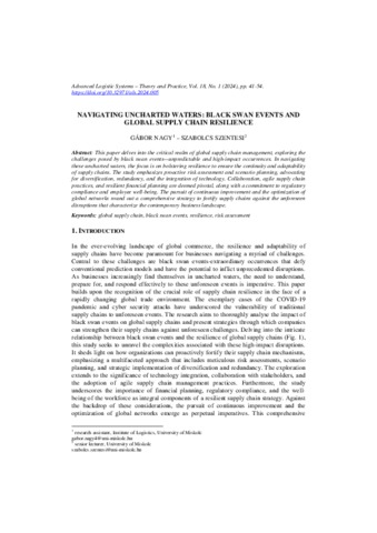 Nagy, Gábor and Szentesi, Szabolcs (2024) Navigating uncharted waters: black swan events and global supply chain resilience. ADVANCED LOGISTIC SYSTEMS: THEORY AND PRACTICE, 18 (1). pp. 41-54. ISSN 1789-2198