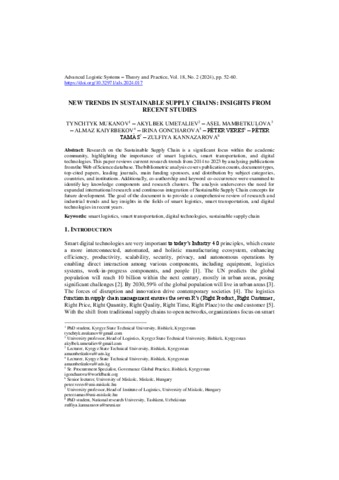 Mukanov, Tynchtyk and Umetaliev, Akylbek and Mambetkulova, Asel and Kaiyrbekov, Almaz and Goncharova, Irina and Veres, Péter and Tamás, Péter and Kannazarova, Zulfiya (2024) New trends in sustainable supply chains: insights from recent studies. ADVANCED LOGISTIC SYSTEMS: THEORY AND PRACTICE, 18 (2). pp. 52-60. ISSN 1789-2198