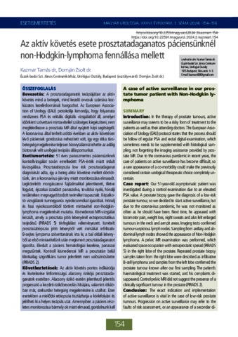 Kazmar, Tamás and Domján, Zsolt (2024) Az aktív követés esete prosztatadaganatos páciensünknél non-Hodgkin-lymphoma fennállása mellett. MAGYAR UROLÓGIA, 2024 (3). pp. 154-156. ISSN 0864-8921