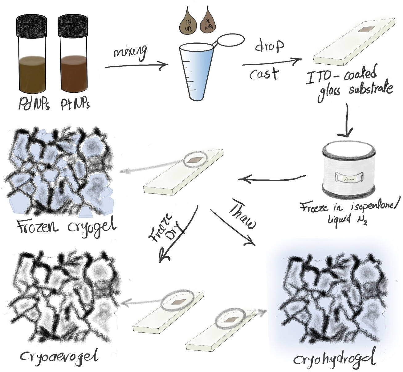 Cryogels made of colloidal nanoparticles (NPs) are a unique material class with a high specific surface area and tunable microstructure. Flash freezing of the nanoparticle building blocks and subsequent freeze-drying of the gels, the so-called cryoaerogelation, allows significant control over morphology, stability and improved electrocatalytic performance. In the present work, the first bimetallic Pt/Pd cryogel films of mixed Pt and Pd NPs are prepared in different molar ratios. High-resolution microscopic and spectroscopic characterization techniques are applied to confirm the final Pt : Pd ratio besides the distribution of nanoparticles throughout the cryogel structure. Scanning electron microscopy (SEM) images of the different prepared cryogel films show a cellular to dendritic superstructure regardless of the Pt and/or Pd composition in a highly reproducible manner. Elemental analysis shows homogenous distribution of Pt and Pd NPs at the microscale for all samples. Since the prepared materials are of utmost importance for catalytic applications, their electrocatalytic activity toward ethanol oxidation reaction (EOR) is investigated. Fine-tuning the concentration of the building blocks, the structure, thickness, and composition of the porous coatings enables high electrocatalytic activity to be achieved. Cryogel thin films with an atomic ratio of 1 : 4 Pt : Pd have the highest electrocatalytic activity for EOR.
