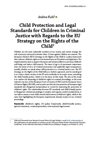 Kuhl, Andrea (2024) Child Protection and Legal Standards for Children in Criminal Justice with Regards to the EU Strategy on the Rights of the Child. EURÓPAI TÜKÖR: AZ INTEGRÁCIÓS STRATÉGIAI MUNKACSOPORT KÉTHAVONTA MEGJELENŐ FOLYÓIRATA, 27 (1). pp. 67-85. ISSN 1416-6151