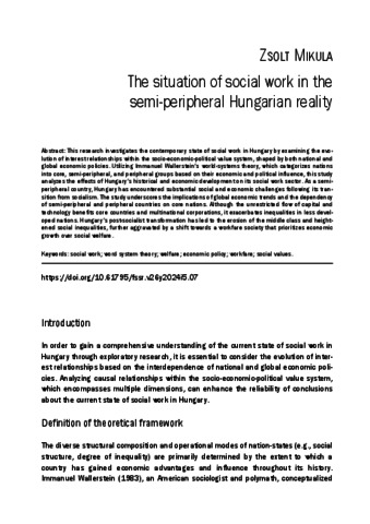 This research investigates the contemporary state of social work in Hungary by examining the evolution of interest relationships within the socio-economic-political value system, shaped by both national and global economic policies. Utilizing Immanuel Wallerstein’s world-systems theory, which categorizes nations into core, semi-peripheral, and peripheral groups based on their economic and political influence, this study analyzes the effects of Hungary’s historical and economic development on its social work sector. As a semi-peripheral country, Hungary has encountered substantial social and economic challenges following its transition from socialism. The study underscores the implications of global economic trends and the dependency of semi-peripheral and peripheral countries on core nations. Although the unrestricted flow of capital and technology benefits core countries and multinational corporations, it exacerbates inequalities in less developed nations. Hungary’s post-socialist transformation has led to the erosion of the middle class and heightened social inequalities, further aggravated by a shift towards a workfare society that prioritizes economic growth over social welfare.