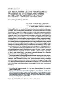 Nádasdy Ádám 2016-ban tette közzé első kiadásban Dante Isteni színjátékának új magyarfordítását. Dante halálának 700. évfordulója 2021-ben alkalmat adott a jelen tanulmányszerzőjének arra, hogy a 2021. évi „Jog és irodalom” c. konferencián megossza gondolatait aNádasdy-fordításnak a klasszikusnak számító Babits-fordításhoz való viszonyáról. E témavizsgálata során a szerző foglalkozott az Isteni színjáték jogtörténeti vonatkozásaival isNéhány reprezentatív szemelvénynek az olasz eredeti szövegből kiinduló összehasonlítóelemzése alapján a szerző a következő főbb konklúziókra jut. Babits fordításának emelkedett költői nyelvezete ma is kiválóan élvezhető, de Nádasdy a legtöbbször hívebben fordít,mint Babits. Nádasdy szövege ugyan kevésbé költői, sőt olykor anakronisztikus, Nádasdyazonban sok helyen kiigazítja Babits pontatlanságait, s néhol az érthetetlenségig homályosparafrázisait is. Babits a dantei szöveget a magyar olvasó gyönyörködtetése céljából általában erősen „felstilizálta”, de Dante puritán nyelvezetét szükség szerint Nádasdy is édesítette.Ami a jogtörténeti vonatkozásokat illeti, Dante Pokla a maga egészében számot tarthat a büntetőjogászok fokozott érdeklődésére. A Pokol XI. énekében a korabeli keresztényteológia tanításainak megfelelően rendszerezi a bűnöket. A fokozott bizalom megjelölésére Dante a maga korában újszerű „fede spezïal” megjelölést használja, ami a bona fidesfogalomtörténete szempontjából is figyelemre méltó.Foglalkozik a szerző azzal a kérdéssel is, hogy Dante hol helyezte el az általa megjelenítésre méltatott jogászokat, például Franciscus Accursius miért a Pokolba került. Dantea jogászok közül a legtöbbre a kánonjog atyját, Gratianust tartotta. A szerző vizsgálja azta kérdést is, hogy Dante Gratianust méltatva a római jog és a kánonjog kettősségére vagyegy, a kánonjogon belüli kettősségre (forum externum/internum) utalt. Dante Iustinianustmint a római jogot kodifikáltató császárt szintén nagyra értékelte, és a Paradicsombanhelyezte el.