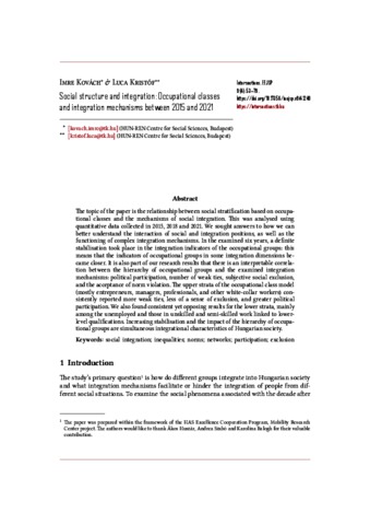 Kovách, Imre and Kristóf, Luca (2024) Social structure and integration: Occupational classes and integration mechanisms between 2015 and 2021. INTERSECTIONS: EAST EUROPEAN JOURNAL OF SOCIETY AND POLITICS, 9 (4). pp. 53-79. ISSN 2416-089X