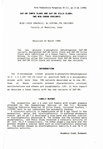 Gonzalez, Olga Lidia and Espina, A. L. and Calcines, P. H. (1990) G6P-DH Santa Clara and G6P-DH Villa Clara : Two new Cuban Variants. ACTA PAEDIATRICA, 30 (1). pp. 17-26.